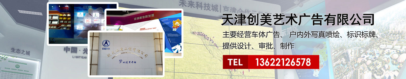 天津創(chuàng)美藝術(shù)廣告有限公司主要經(jīng)營車體廣告、 戶內(nèi)外寫真噴繪、標識標牌、提供設計、審批、制作、發(fā)布的服務。
